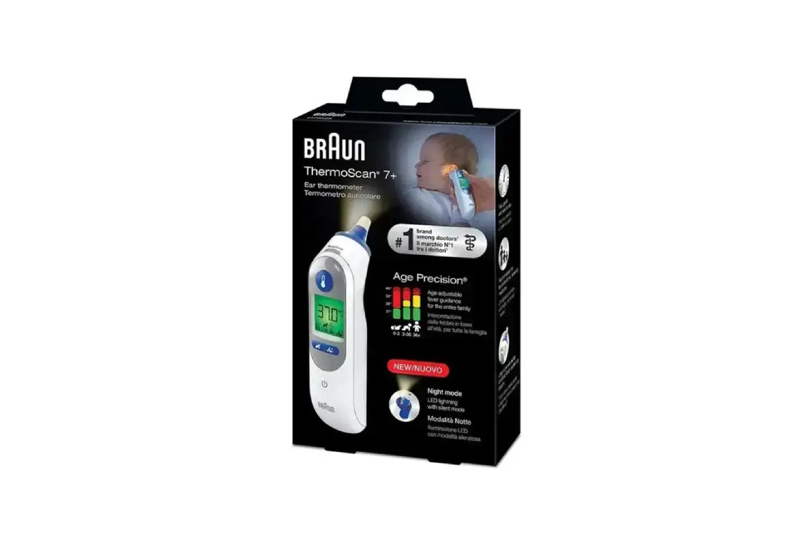 This thermometer features infrared technology that takes a temperature in seconds and ExactTemp system uses a light and beep to confirm proper positioning. It can be used as a kids and baby thermometer and as a thermometer for adults.It’s not just a child thermometer, this gentle infrared thermometer can be used for the whole family. The disposable ear thermometer covers/lens filters make sharing sanitary.Get quick, reliable results with the Braun ThermoScan 7 Digital Thermometer. This ear thermometer uses Age Precision Technology for age-adjustable fever guidance, and a color-coded display for easy interpretation of the results.
