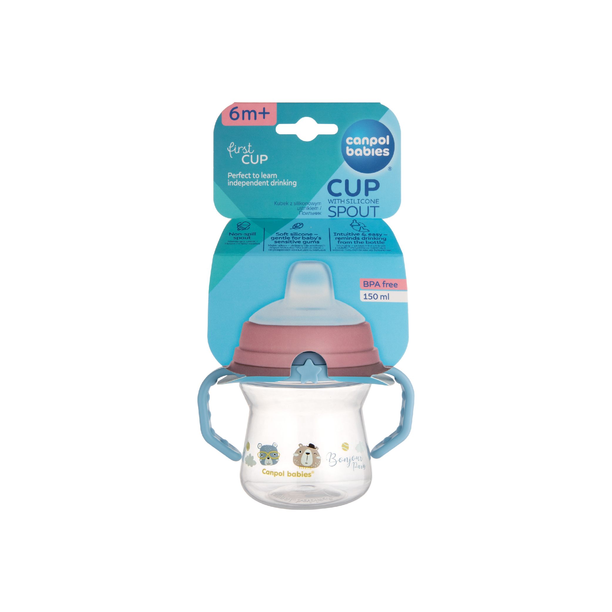 Perfect for learning to drink independently after 6 months, thanks to the non-spill spout that prevents spillage. The non-spill spout does not leak even if the child tilts or drops the cup. The cup is intuitive, like drinking from a bottle, allowing for a quick and easy transition from bottle to cup. Exceptionally soft spout is made of delicate silicone, safe for the baby’s sensitive gums. The cup is lightweight with an ergonomic profiled structure. Comfortable handles make it easy for the child to hold it in small hands. A small number of elements makes it easy to assemble and clean – the cup has no unnecessary nooks and crannies, thanks to which all parts can be washed quickly. The spout also can be steamed. Canpol non-spill cup with a silicone spout 150ml is transparent, which allows you to control the amount of the liquid taken by the child. Canpol babies non-spill cup 150ml FirstCup BONJOUR PARIS blue has a tight cover that protects the spout from getting dirty. Canpol non-spill cup with silicone spout 150ml FirstCup BONJOUR PARIS blue is perfect for the youngest children from 6 months of age. Replaceable silicone spout is available.