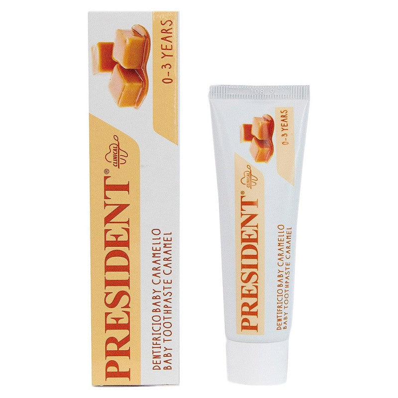 President Baby 0- 3 Years Toothpaste is formulated with caramel flavor to encourage children to brush their teeth.